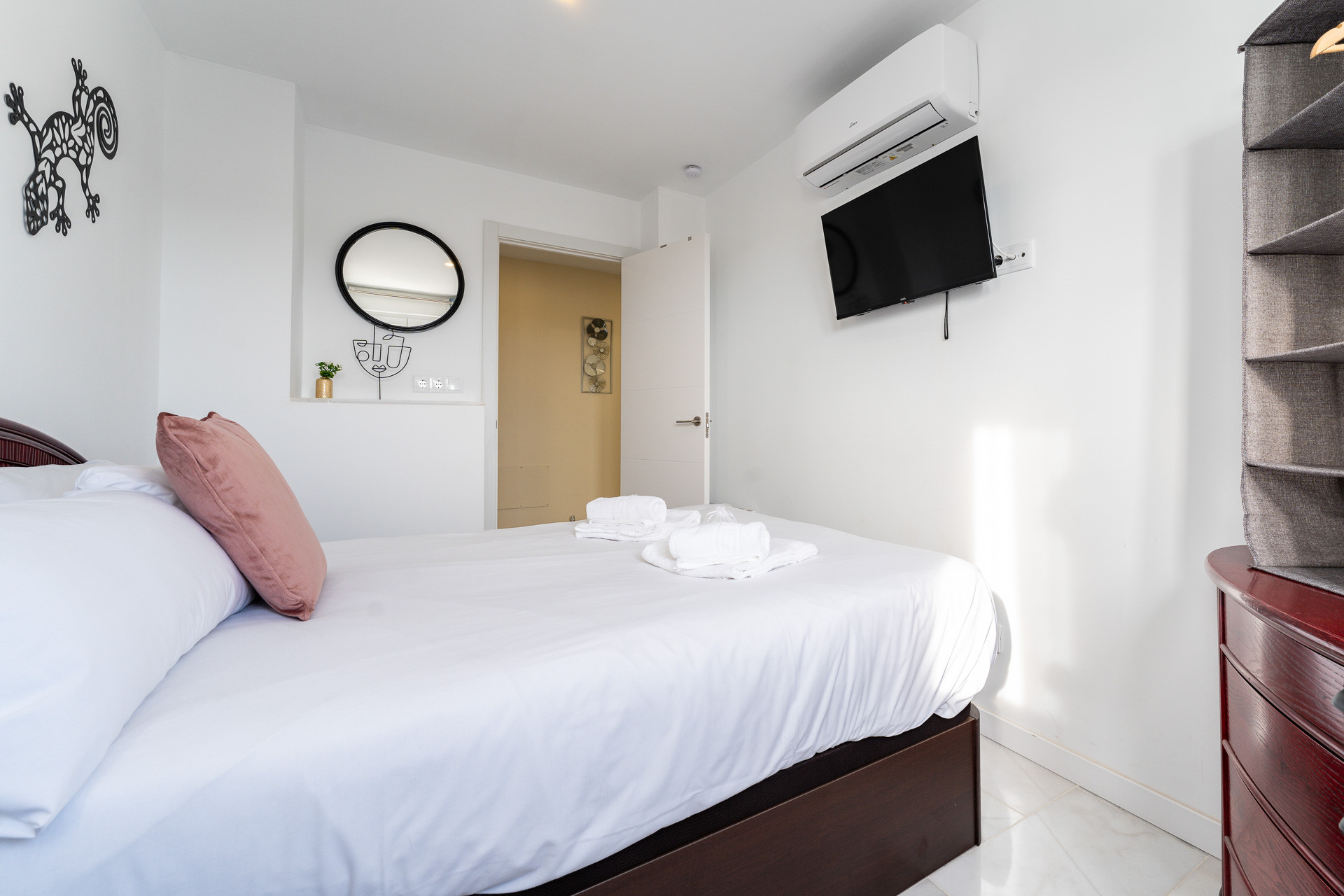 El apartamento dispone de tres dormitorios, todos ellos con camas de matrimonio, televisión y aire acondicionado, garantizando el máximo confort y descanso. Además, cuenta con dos baños completos con ducha.