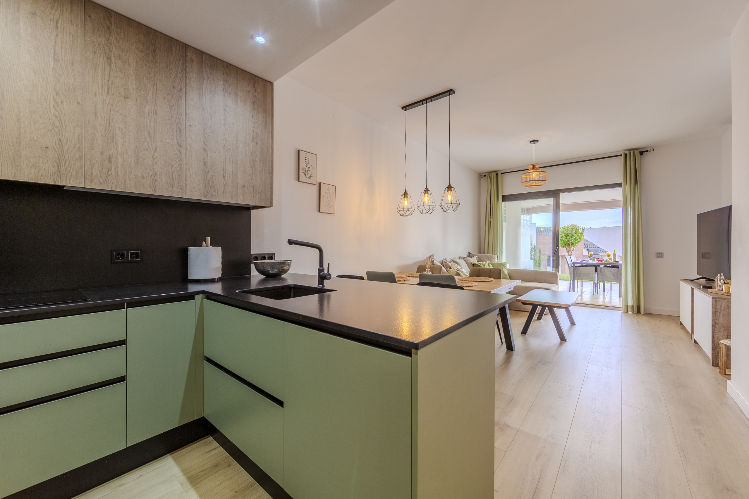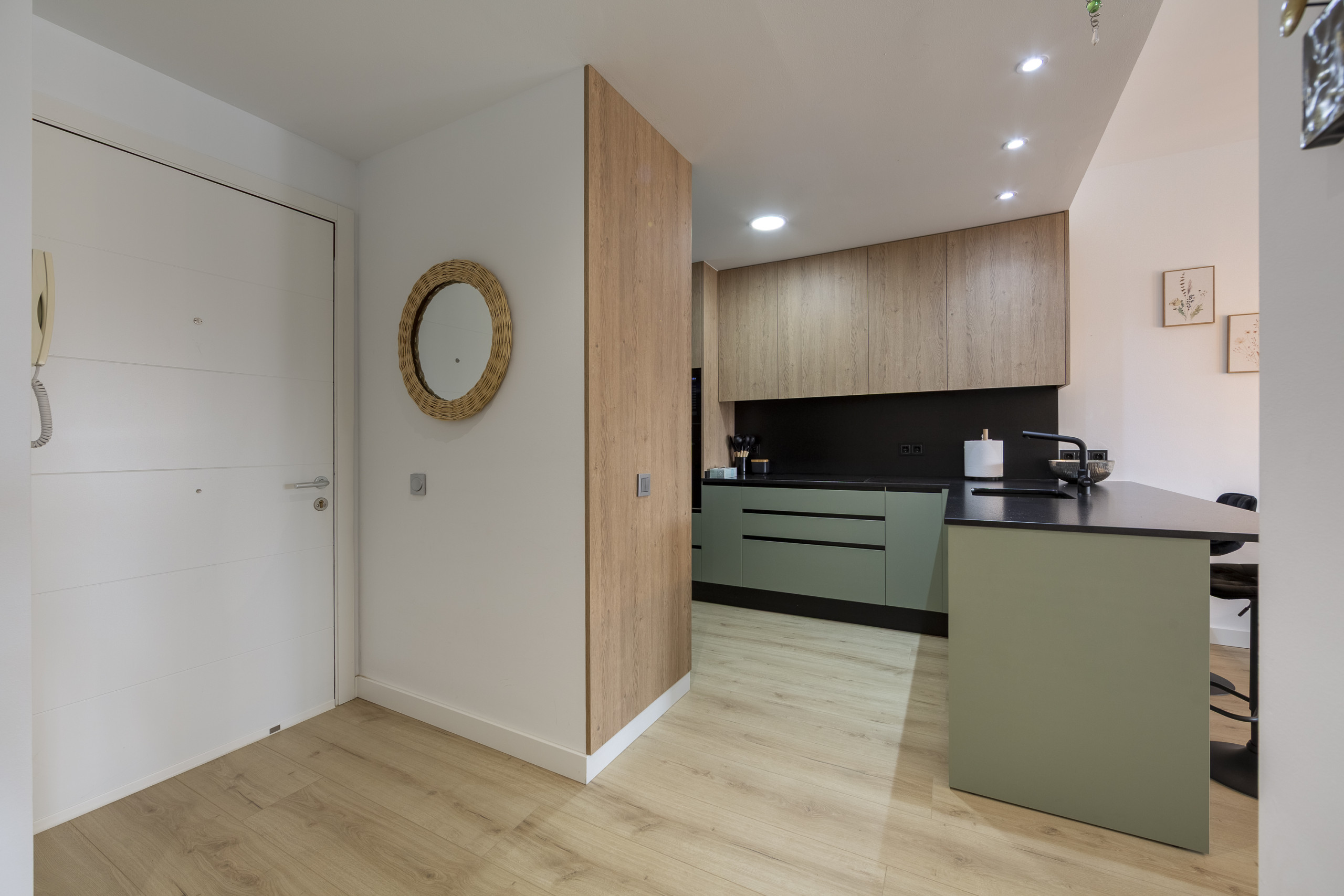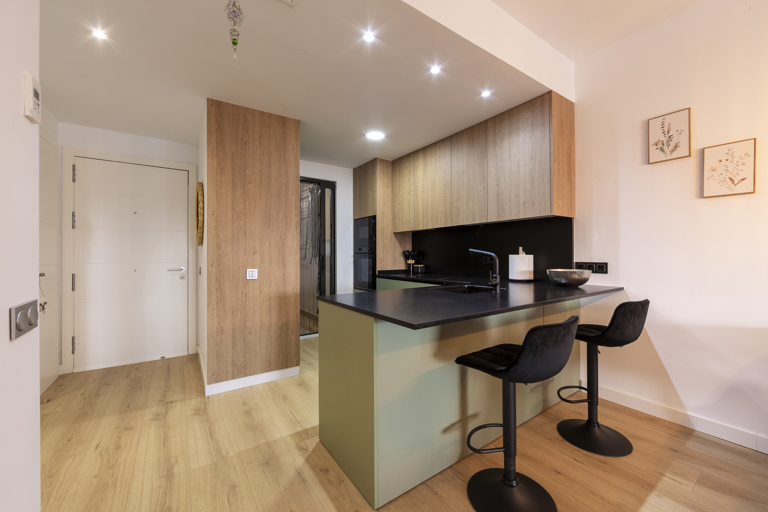 La cocina, completamente equipada, se integra con el salón, creando un ambiente luminoso. Además, dispone de un pequeño lavadero. Desde el salón, accedes a la gran terraza perfecta para disfrutar del aire libre.