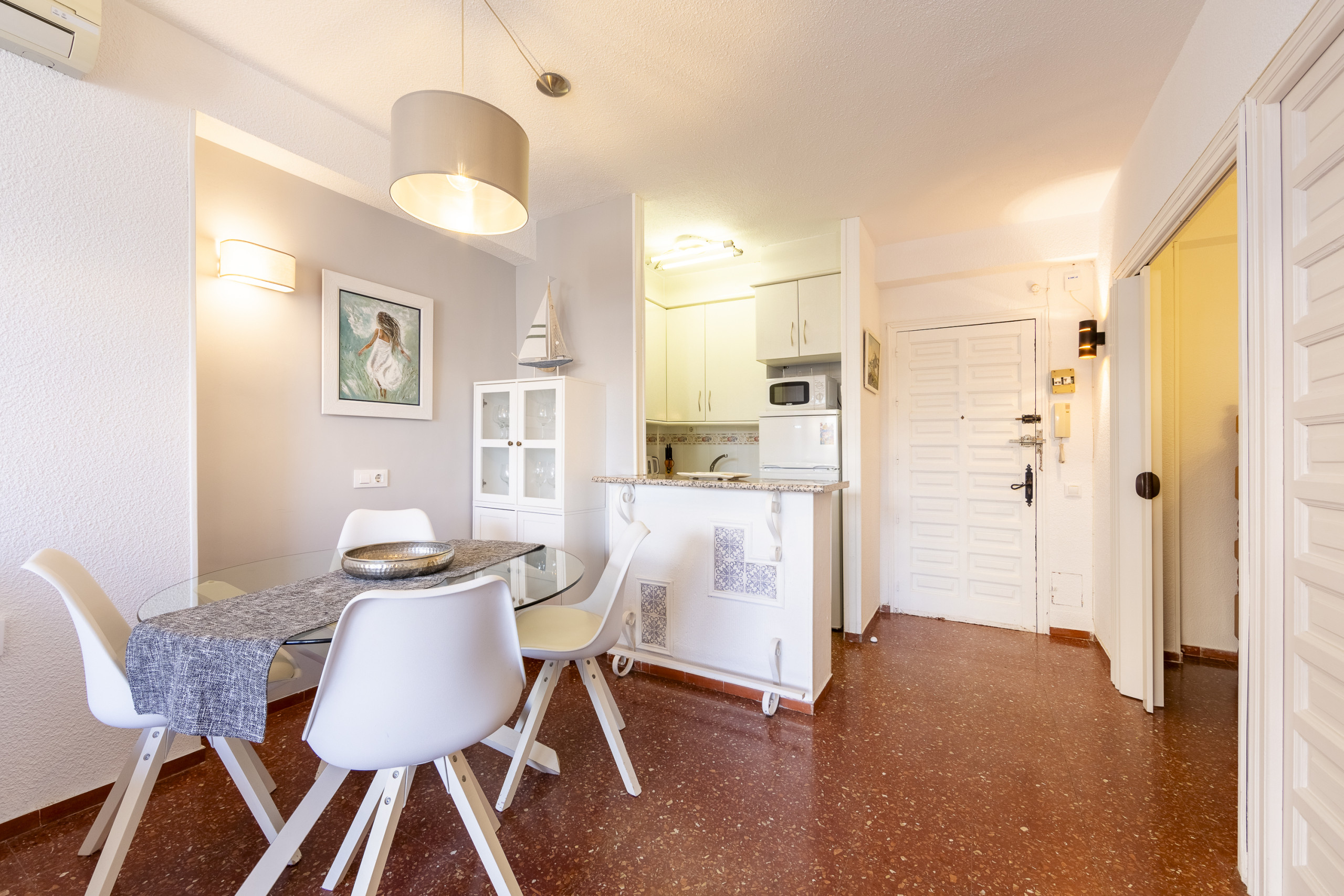 Fully furnished, bright and with everything you need to enjoy an ideal stay. Living room, with chaise longue convertible into a bed, kitchen with breakfast bar —fully equipped— integrated into the living room itself, interior patio, bedroom with bed and bunk bed, master bedroom with double bed and bathroom.
