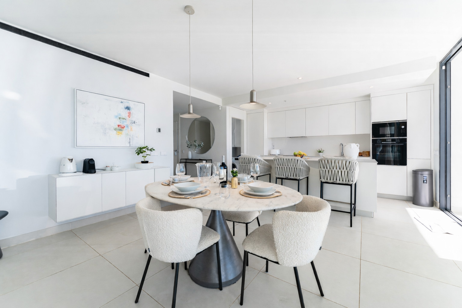 The heart of the accommodation is its living-dining room with an open kitchen, a bright, airy space decorated with taste. The kitchen, fully equipped with a dishwasher, microwave, oven and everything necessary, integrates perfectly with a spacious, comfortable and very welcoming living room.