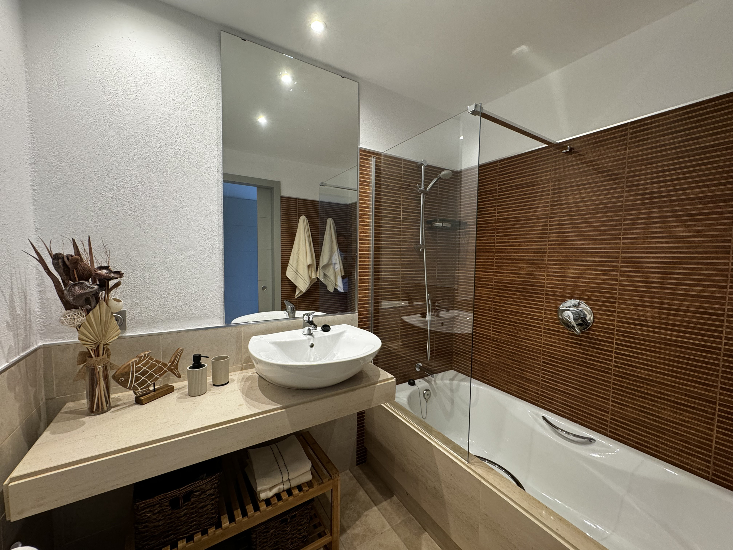 The apartment has three elegantly distributed bedrooms: one with a double bed, another with a king-size bed, and a third with a queen-size bed, ensuring restful sleep for all guests. Two bathrooms with shower complete the bedroom area, providing privacy and comfort.