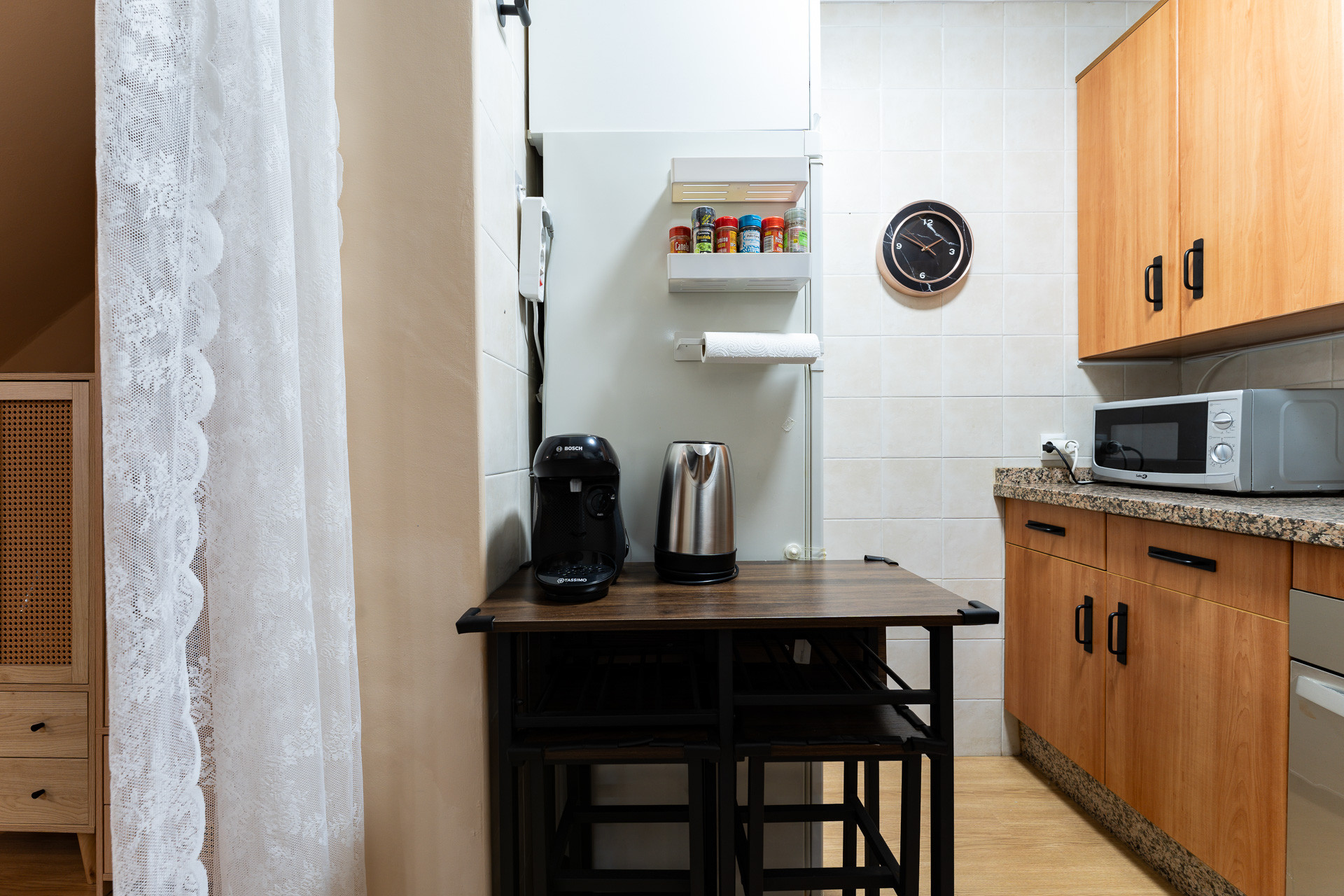 Upon entering the property, we find a bright living room equipped with TV, air conditioning, sofa bed and a small dining area. Next is an individual bedroom with a wardrobe, very cosy and quiet. On the same floor is the fully equipped kitchen with oven, microwave, coffee maker, kettle, fridge and everything necessary for a comfortable stay. Next to the kitchen there is a small utility room and a full bathroom with shower.