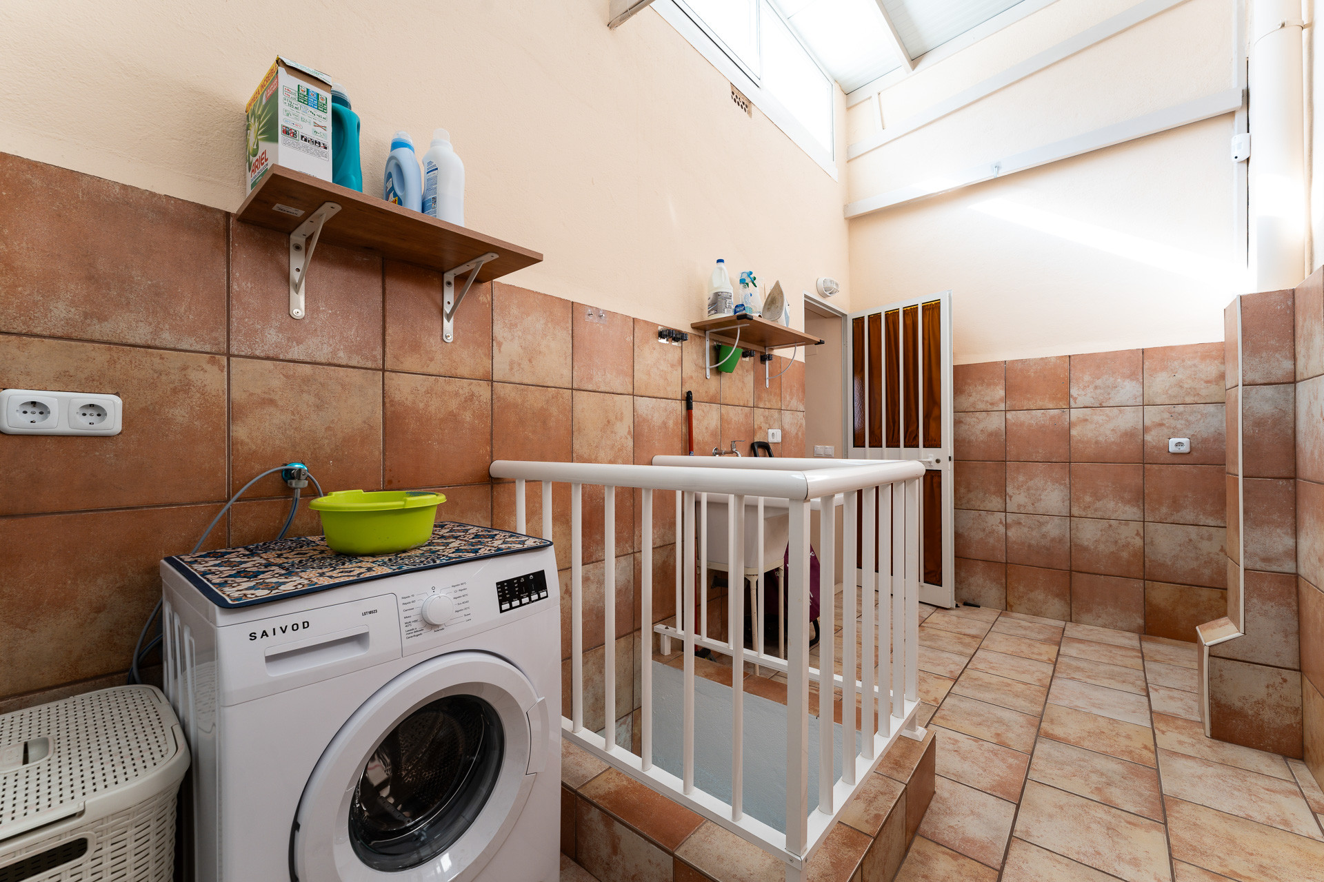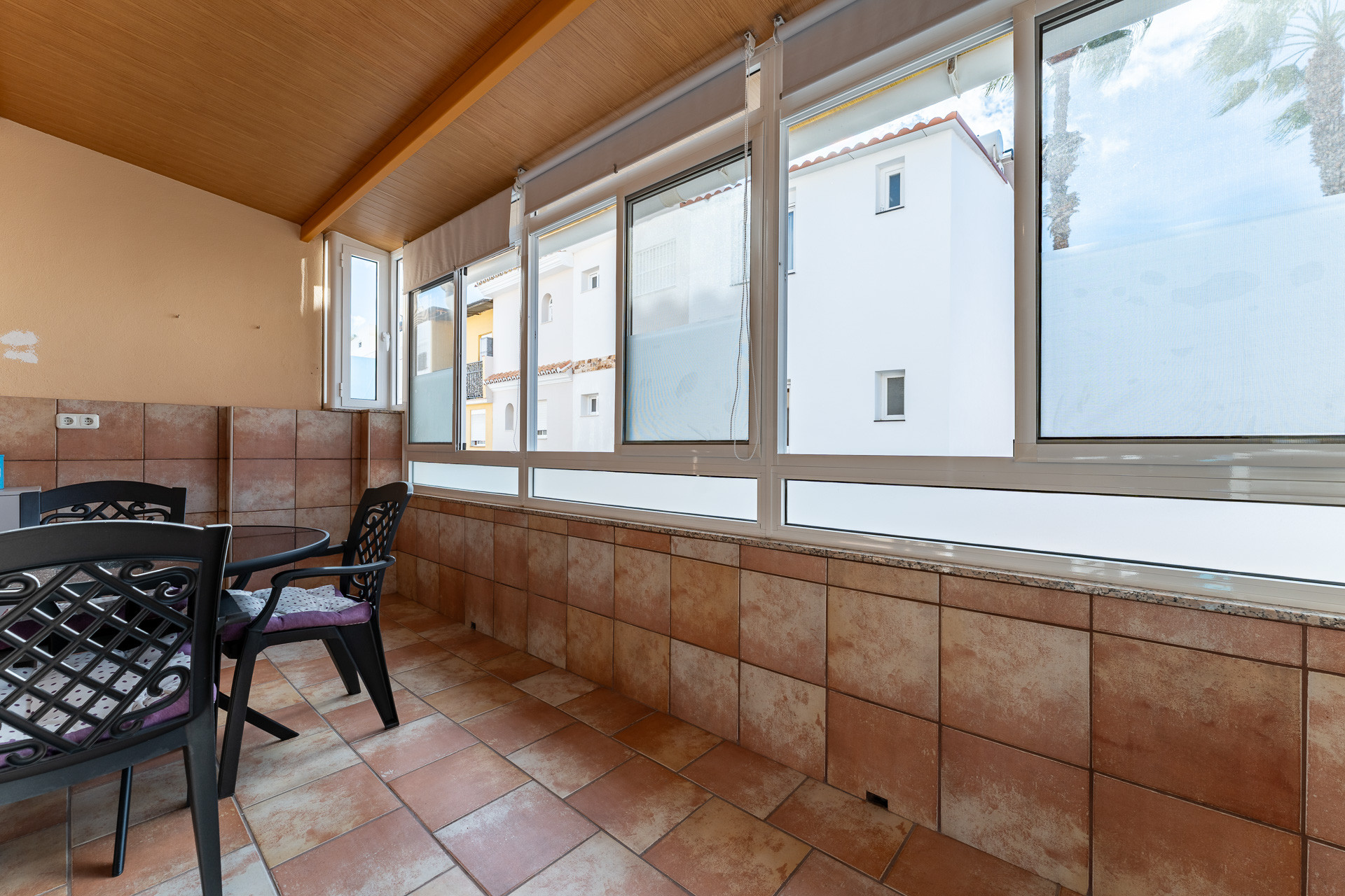 Climbing the stairs, we access the upper floor, where a spacious interior courtyard stands out, providing light and space. On this floor, there is the second bedroom with a double bed and air conditioning, as well as a large enclosed terrace, with wide windows that can be opened, ideal for enjoying the Mediterranean climate all year round.