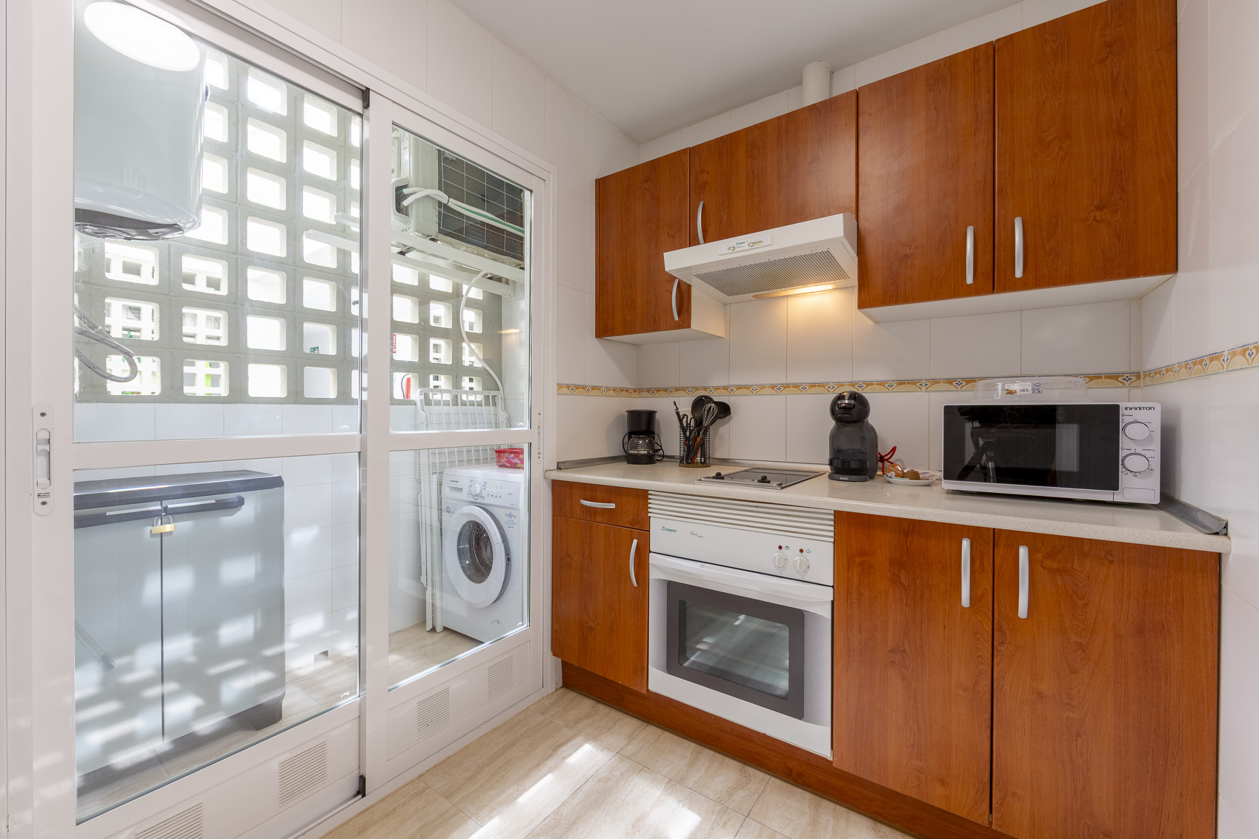 L'appartement, avec climatisation, dispose de 2 chambres, d'un salon accueillant, d'une cuisine entièrement équipée avec réfrigérateur et cafetière, et d'une salle de bain avec baignoire.