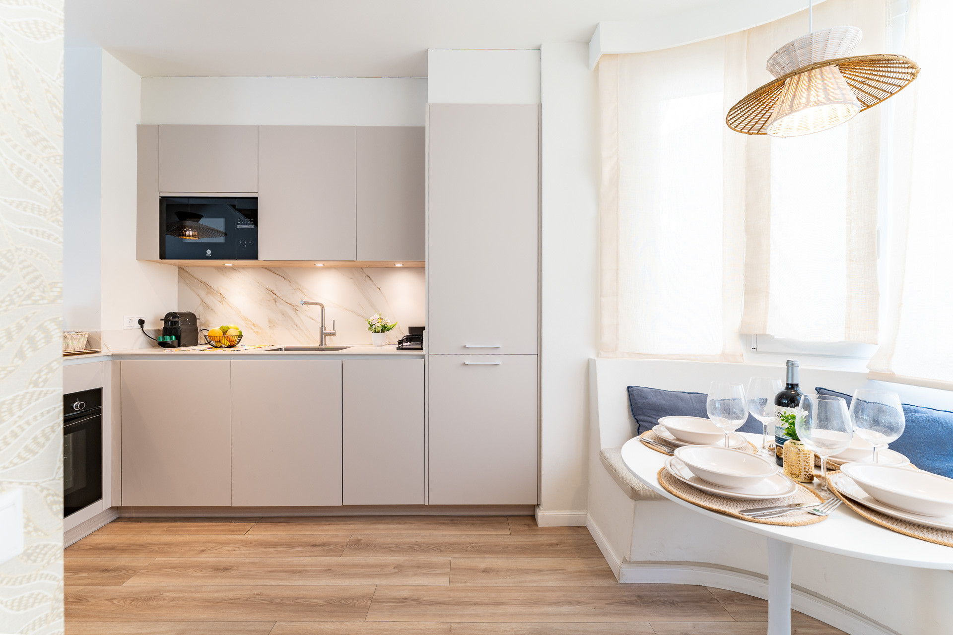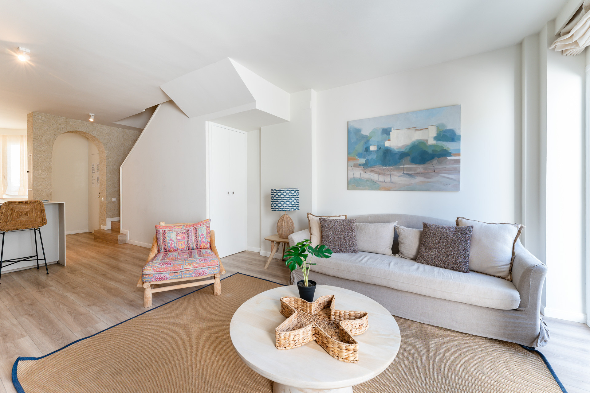 L'appartement dispose d'un salon spacieux et lumineux, parfait pour se détendre après une journée à la plage, connecté à une cuisine américaine entièrement équipée (réfrigérateur, four, micro-ondes et tout le nécessaire)