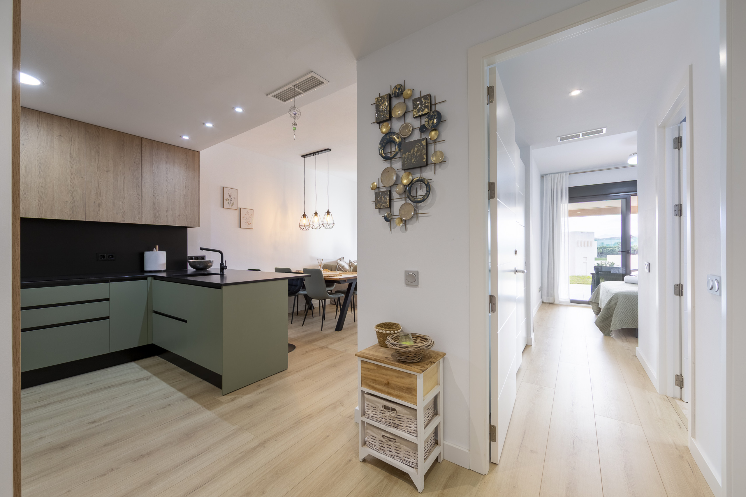 La cuisine, entièrement équipée, s'intègre au salon, créant un environnement lumineux. De plus, elle dispose d'une petite buanderie. Depuis le salon, vous accédez à la grande terrasse parfaite pour profiter de l'air libre.