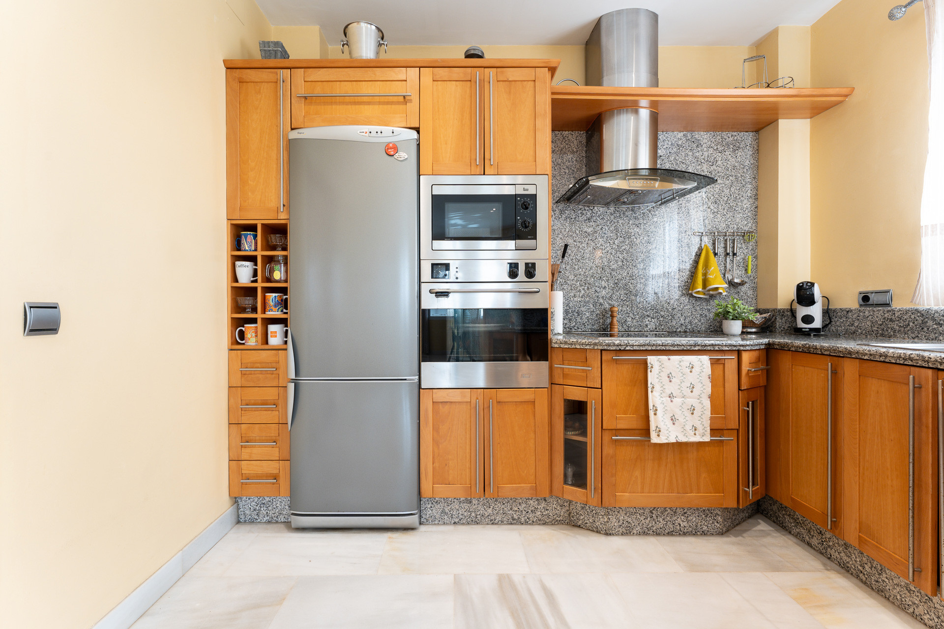La cuisine américaine, ouverte et lumineuse, vous invite à vous réunir et à passer des moments inoubliables en famille. Entièrement équipée de tous les appareils et ustensiles nécessaires, elle est l'endroit idéal pour préparer de délicieux repas tout en partageant rires et conversations.