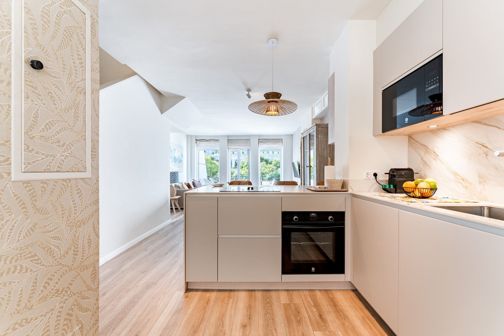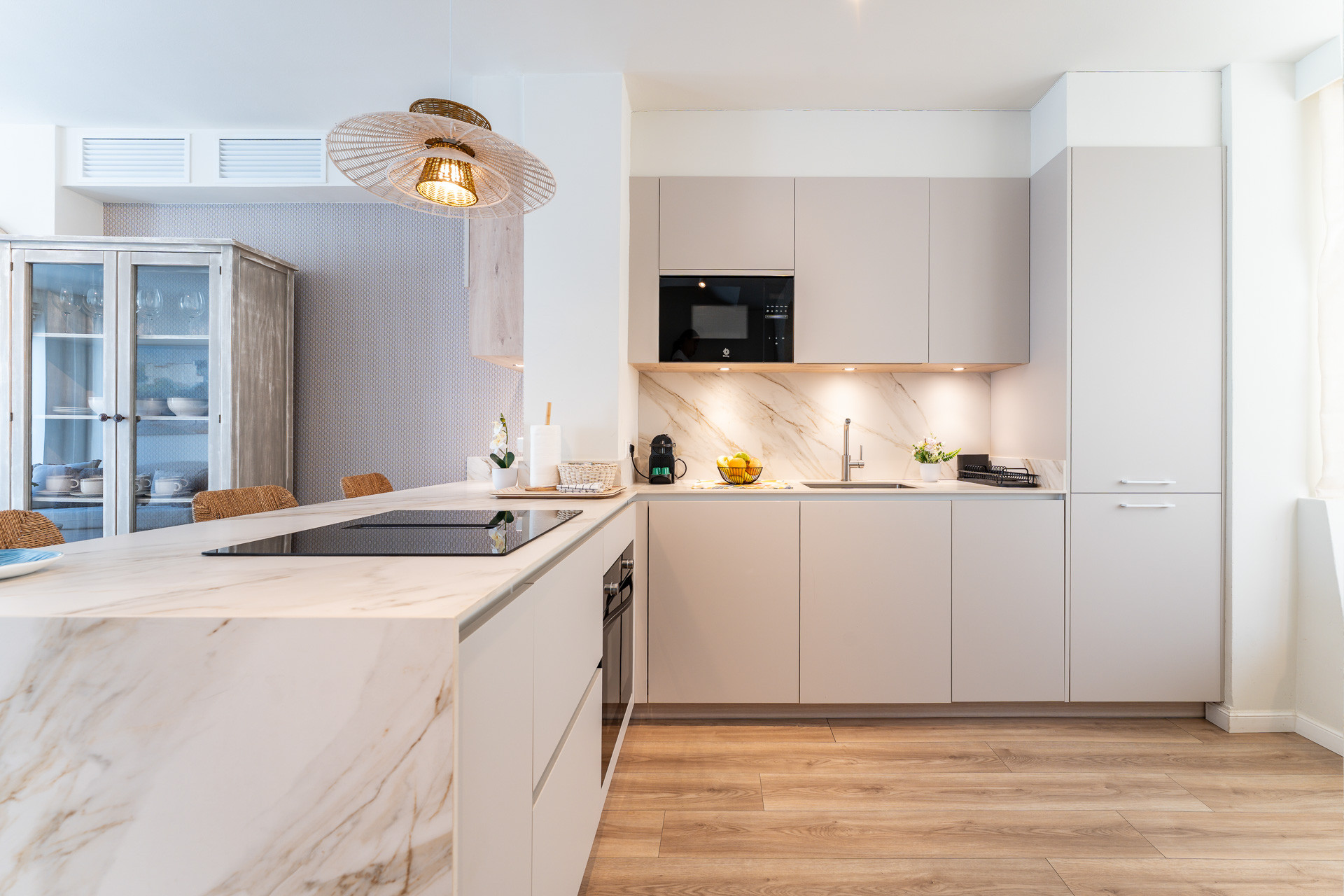 La cucina americana, a induzione, è attrezzata con frigorifero, microonde, forno, congelatore, lavastoviglie, stoviglie/posate, utensili da cucina, caffettiera, tostapane, bollitore e spremi agrumi.